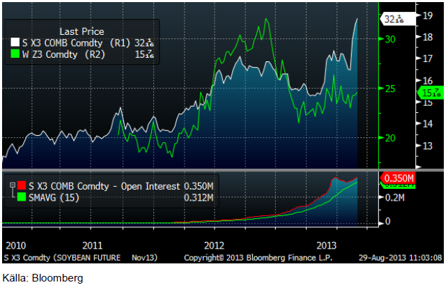 Sojamarknaden har oroat sig för att torkan i USA, som inträffat precis när plantorna sätter baljor, ska medföra en mindre skörd än väntat. Flera firmor har successivt sänkt sina skördeestimat och de senaste kommer att ge USA ytterst lite utgående lager.