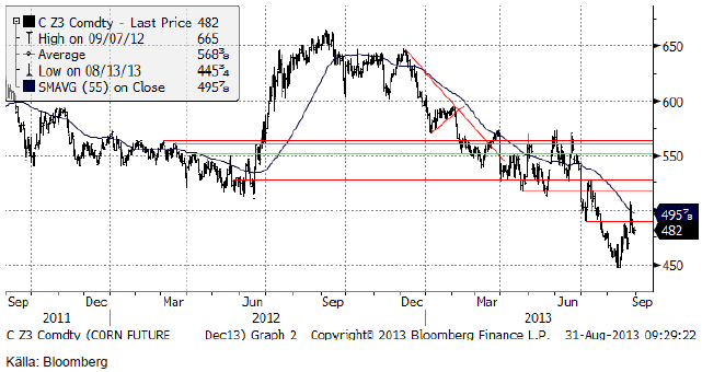 Majspriset (december 2013) har stigit samtidigt som många andra råvaror gjort det, men rekylerade ner i veckan som gick. Allt torrare väder i USA, som har drabbat sojan, framförallt, har ändå haft en effekt på majspriset också. Det är för tidigt att avgöra om uppgången och den lilla rekylen nedåt förra veckan, är början på en ny vändning uppåt, eller bara en paus innan ytterligare prisfall. Vi skriver under sojabönsrubriken om att man i Brasilien ökar arealen sojabönor kraftigt. Till viss del sker detta på bekostnad av betesmark, men till viss del också på bekostnad av majsen.