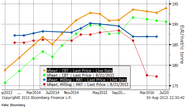 Liksom förra veckan vill jag påminna om att det finns lantbrukare som nu tänker lagra sin spannmål i hopp om att kunna sälja den dyrare någon gång i vinter. I boken ”Bättre betalt för skörden – riskhantering för lantbrukare” har detta inte varit en framgångsrik strategi i sig, testat sedan 1980. Det är en framgångsrik strategi om det finns ett contango i Chicagomarknaden, som kan ge lönsamhet genom en så kallad ”cash-and-carry trade”. Man tjänar helt enkelt pengar på att terminspremien över spot i terminsmarknaden är större än finansierings- och lagringskostnaden för spannmålen. Det är en lågriskstrategi som i bästa fall ger en attraktiv ränteplacering.