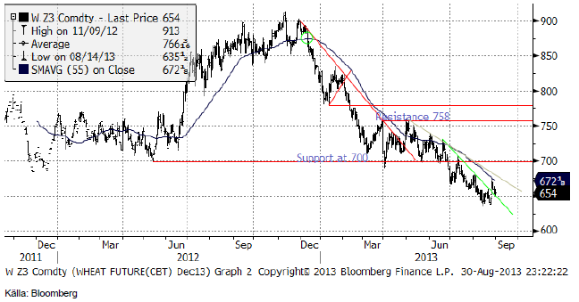 Väderleksprognosen enligt GFS-modellen har som vi skrivit om ovan under odlingsväder, slagit om till betydligt mindre torrt / mer vått. Det är möjligt att detta kan trigga ett brott nedåt under stödet på 1350.