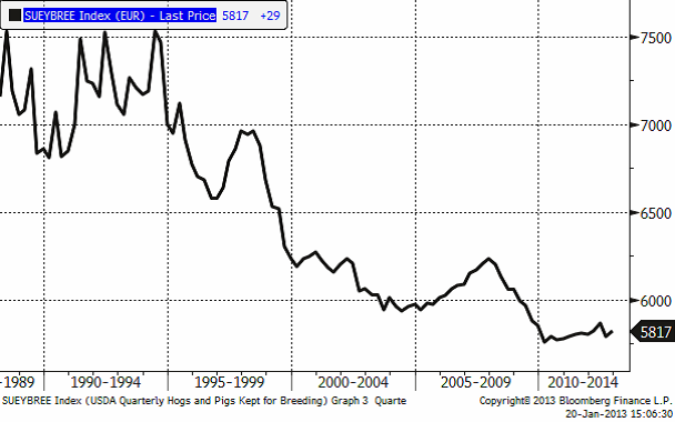 Omfattningen av grisbranschen i USA visade en liten uppgång det sista kvartalet förra året. Det var en ökning med 29,000 djur. Antalet djur har sedan 90-talet minskat från 7.5 miljoner djur till 5.8 miljoner, som vi ser i diagrammet nedan.