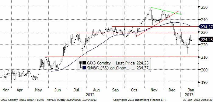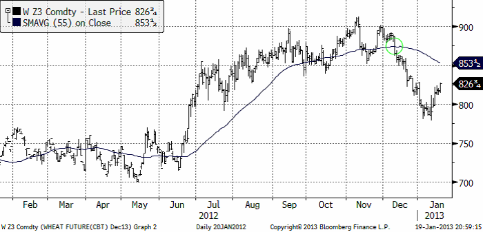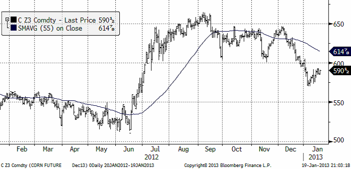 Majspriset (december 2013) fortsatte att stiga hela förra veckan, efter WASDE-rapporten fredagen den 11 januari. Tekniskt ser det ut som en rekyl uppåt mot en fallande trend. 600 cent på decemberkontraktet har tidigare bevisat sig vara en viktig nivå, som nu fungerar som ett motstånd. Den tekniska analysen indikerar alltså att prisuppgången efter lager- och WASDE-rapporten från USDA, börjar närma sig sitt slut och att trenden nedåt kan fortsätta.