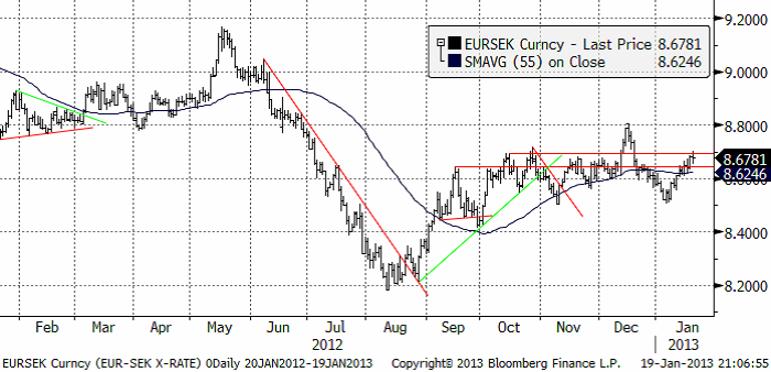 EURSEK stärktes successivt under veckan som gick och nådde upp till de gamla motståndsnivåerna. Det finns inte mycket ny information som ger anledning till att anta annat än att den ”sidledes” rörelse vi sett de senaste månaderna ska fortsätta.