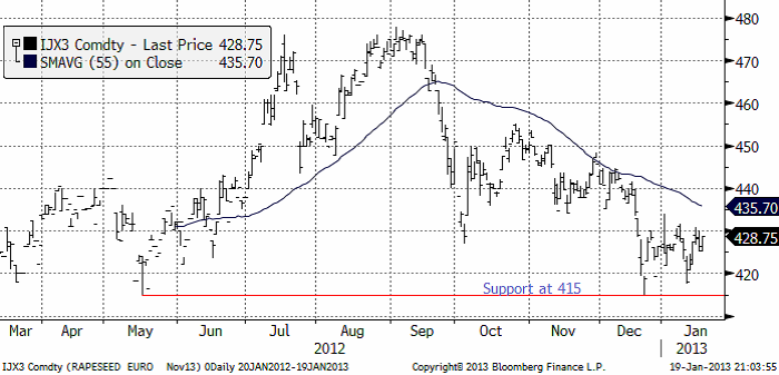 Rapspriset (november 2013) fann stöd vid 415 euro. Det senaste prisfallet nådde faktiskt inte ända ner till 415 euro. Det fanns alltså ivriga fyndköpare som väntade.