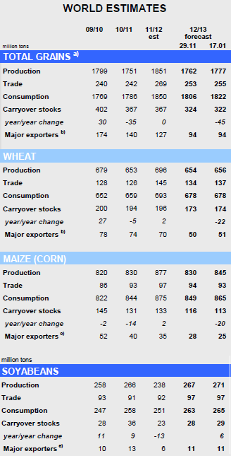 IGC (International Grains Council) justerar upp sitt estimat något för den globala spannmålsproduktionen 2012/13 från 1762 mt till 1777 mt, vilket dock är betydligt lägre än produktionen 2011/12. Trots en förväntad nedgång i konsumtionen för första gången på 14 år, så väntas lagren att minska med 45 mt.