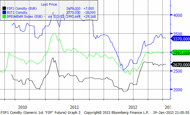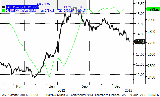 Slutligen så den gröna linjen. Den visar priset på helmjölkspulver (WMP) FOB Västeuropa. Källan är USDA och priserna uppdateras varannan vecka. Vi ser att WMP-priset legat stabilt det fjärde kvartalet förra året, med en liten nedgång mot slutet av året. 2013 har dock börjat med en liten prisuppgång.