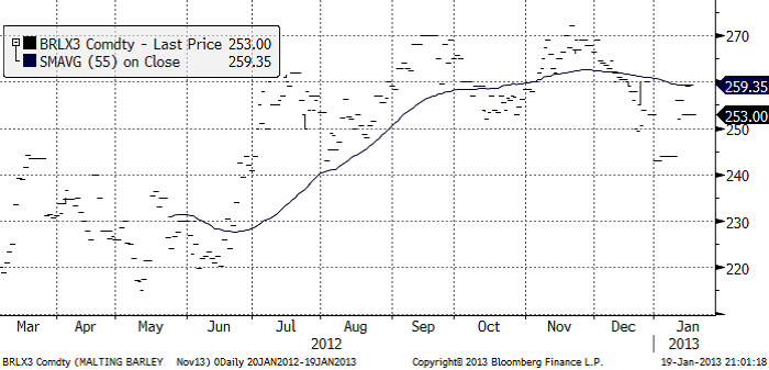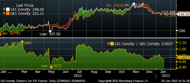 Nedan ser vi november (2013) kontraktet, där priset föll kraftigt i fredags, men återhämtade sig och stängde på 217.50, nästan oförändrat på dagen.