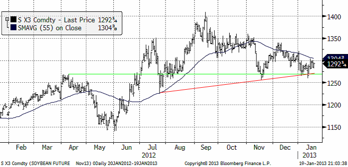Sojabönorna hängde med majs och vete uppåt, också med stöd av en något svagare dollar i veckan. Trenden är alltjämt nedåtriktad. Brottet av stödlinjen visade sig falskt, än så länge. 55-dagars glidande medelvärde, som många tittar på, ligger strax över dagens kursnivå och kan ge anledning till säljordrar kring den. Tekniskt är bilden ännu i vänteläge. Stiger kursen från de här nivåerna, bryts den nedåtgående trenden.