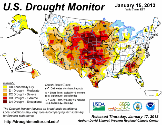 Antalet nötkreatur i USA rapporteras nu ligga på 60-års-lägsta, efter att de slaktats ut i brist på foder (crop condition var ännu sämre för betesmark i USA, än de var för majs i somras/höstas).