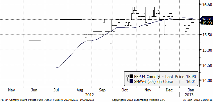 Potatispriset för leverans i april nästa år (2014) steg från 15.70 för en vecka sedan till 15.90 i fredags vid stängning.