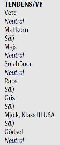 Det var allmän prisuppgång – mot de fallande pristrenderna – i veckan på spannmål och oljeväxter. Även om torkan i USA slog nya rekord i veckan som gick, ser den tekniska bilden inte så tydligt positiv ut. Vi går därför över från köprekommendation på vete och majs, till neutral rekommendation. Vi byter rekommendation från sälj till neutral på sojabönor. Effekten av WASDE-rapporten har ebbat ut och på ena sidan har marknaden nu torkan i USA och kanske bristen på nederbörd i Argentina. På den andra finns det faktum att priset är högt och därmed ska stimulera till högre produktion.