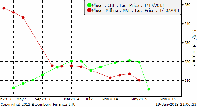 Av diagrammet ovan ser man att gammal skörd av Matif-vete är avsevärt mycket dyrare än Chicagovetet. Maj-terminen handlas dessutom lägre än mars-terminen. Det säger att den som väntar med att sälja till maj riskerar att få väsentligt sämre betalt – och dessutom får bära ränte- och lagerkostnader fram till dess.