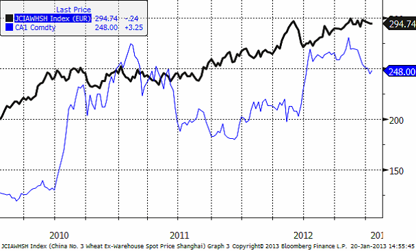 Det kinesiska vetepriset FOB lagerhus i Shanghai (svart linje nedan) har hittills i år fallet ner med 5 euro till 294.74 euro / ton. Vi får tolka det som ett styrketecken, eftersom det är ordentligt mycket mindre än t ex Matif (blå linje nedan).