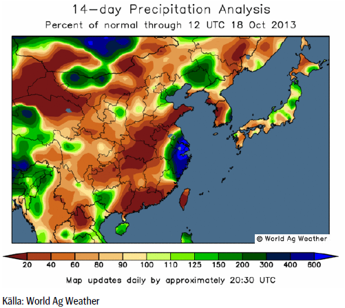 Torkan i Kina är bra för skörden av majs och sojabönor, men hindrar sådden av höstvetet. Detta väntas leda till att 10% mindre areal blir sådd i år än man tidigare hoppats. CNGOIC estimerar Kinas vete produktion till 122.17 mt 2012/13, jämfört med USDA’s estimat på 121 mt.