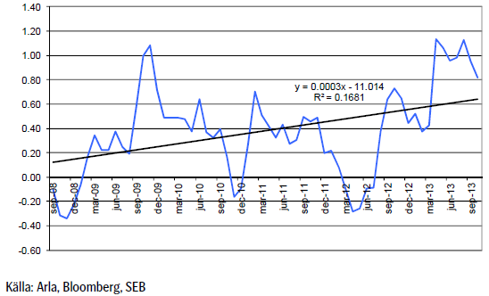 En till skillnaden mellan Eurex-priserna och Arla-priserna anpassad linjär kurva, tycks visa en med tiden ökande skillnad, som vi ser i diagrammet nedan. I datamaterialet är faktiskt den här tendensen till ökande skillnad statistiskt signifikant.