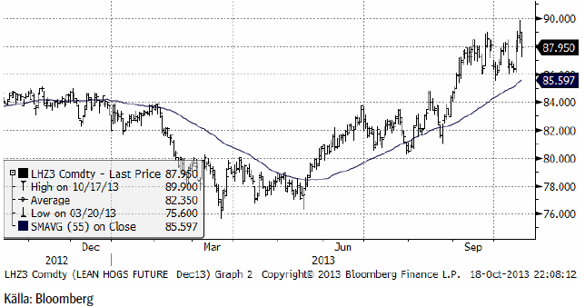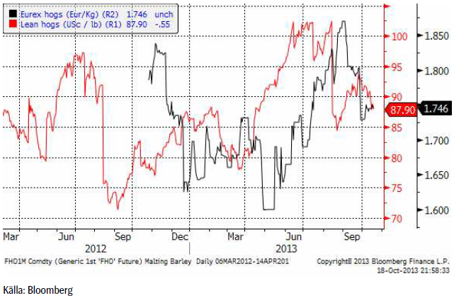 Nedan ser vi spotkontraktens historik för Eurex-grisar och Lean Hogs.