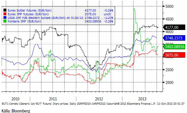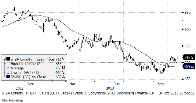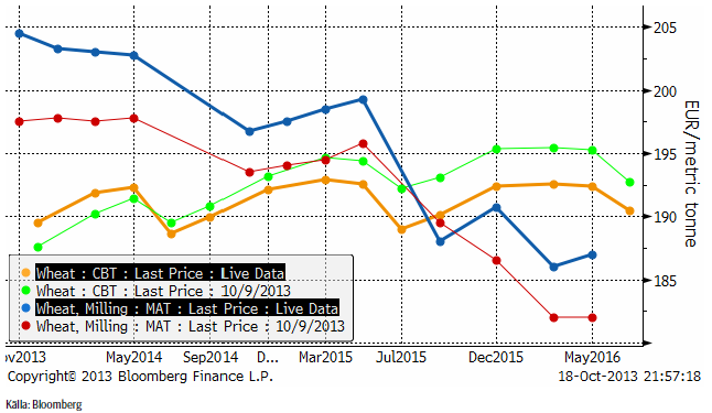 Terminspriset (november) ligger nu 4.5 euro under vetepriset, för november 2013, som snart förfaller.