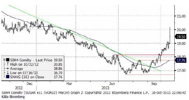 Det råder inget tvivel om att trenden för sockerpriset har vänts från att vara fallande de senaste åren, till att bli stigande. Vi rekommenderar en köpt position i socker.