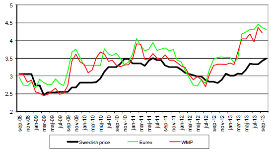 Det svenska avräkningspriset som betalas till mjölkbönder fortsätter att stiga, enligt Arlas prisnotering. Nedan ser vi ett diagram över prisutvecklingen på mjölk och på ett pris härlett från priset på terminerna på Eurex-börsen för SMP och smör, omräknat till kronor per Kg. USDA publicerar även ett index för WMP FOB Western Europe, som omräknat till kilo mjölk ligger mycket nära Eurexbörsens priser.