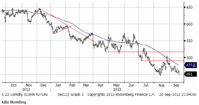 Majspriset (december 2013) föll liksom många råvaror kraftigt i pris sent i fredags och är nu strax över stödet på 450 cent.