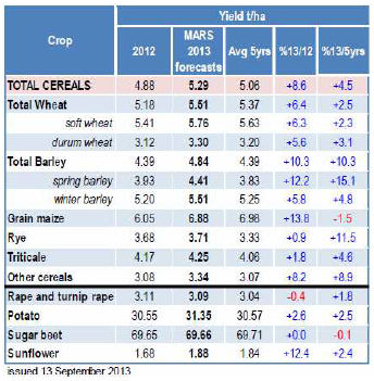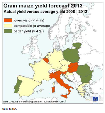 EU Kommissionens MARS-enhet kom med sin rapport i måndags där de justerade ner avkastningen för majs sedan förra månadens rapport då bl.a det varma och torra vädret i Italien, med temperaturer upp till 40 grader i de norra delarna av landet, under blomningen i augusti har skadat grödorna. Den genomsnittliga avkastningen justeras ner från förra månadens 6.97 t/ha till 6.88 t/ha, vilket fortfarande är en nivå som ligger över förra årets 6.05 t/ha. Frankrike är den största producenten av majs i EU-28 och estimeras en avkastning på 9.01 t/ha i år, medan Italien under förra året tog sig upp på en 2:a plats då Rumänen – som annars är näst största producenten – drabbades av värmebölja under sommaren med en lägre produktion som följd. Italienska lantbrukare väntas skörda 8.66 t/ha, vilket är ner från förra månadens 8.92 t/ha.