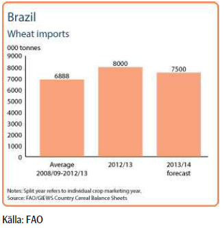 Trots skadorna på grödorna väntas produktionen att öka och importen under 2013/14 väntas minska med 6% till 7.5 mt. Under säsongen 2012/13 har ett minskat utbud, framförallt pga minskad produktion och exportrestriktioner i Argentina, fått Brasilien att istället importera vete från USA och Kanada.