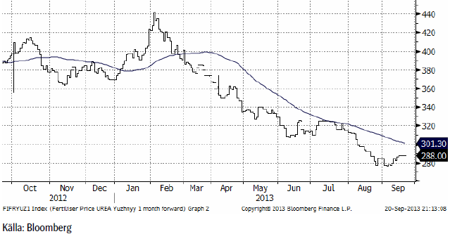 Priset på kväve / urea steg 1 dollar på veckan til 288 dollar per ton. Kanske kan det låga priset tolkas som att amerikanska lantbrukare sänker så mer sojabönor och mindre majs nästa år?