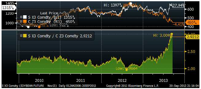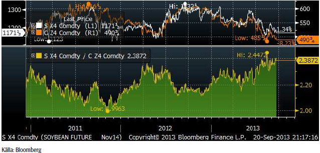 Allt fler börjar nu fråga sig hur nästa år kommer att te sig. De höga sojapriserna – och låga majspriserna har redan fått brasilianarna att överge majs och byta till soja, så att skörden väntas nå en ny rekordnivå. Kvoten mellan priserna på november-soja och december-majs har gått från 2 till 2.92 sedan samma tid förra året. Vi ser detta i diagrammet nedan.