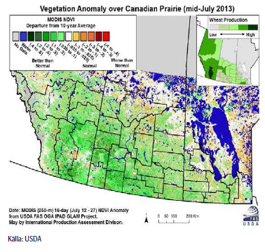 För Kanada beräknar USDA en rekordavkastning, trots en sen start av sådden pga av snötäcket som låg kvar och temperaturer under det normala som resulterade i vattendränkta fält. Bra väder under juni och juli satte dock fart på grödorna vilket kompenserade den sena starten. Den kanadensiska veteproduktionen beräknas uppgå till 31.5 mt, en ökning med 16% från förra året och upp 6.8% från förra månadens rapport.