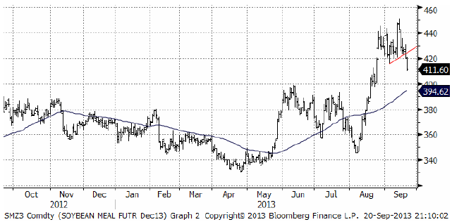 Sojamarknaden är naturligt uppdelad på sojamjöl och sojaolja och det är två helt olika världar. Vi ser prishistoriken på sojamjölet nedan. Köpsignalen på uppsidan visade sig vara ”falsk” när priset föll tillbaka. Falska köpsignaler följs ofta av ett utbrott på nedsidan och det fick vi i fredagskvällens handel. Priset kan nog gå ner till 400 dollar per short ton. Men man ska också komma ihåg att det var helgdag i Asien i fredags och att köparna därför inte var i marknaden.