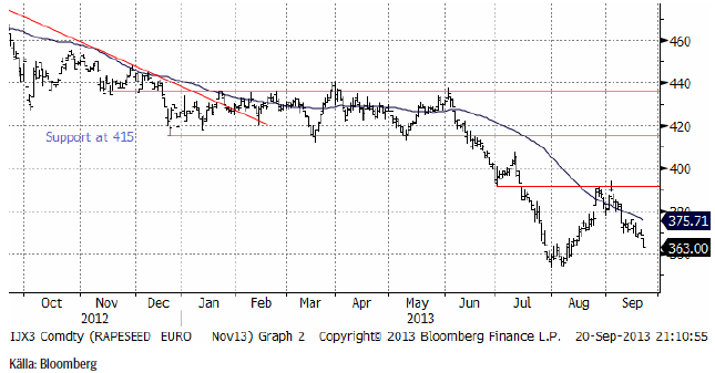 Rapspriset (november 2013) fortsatte sjönk hela veckan och föll slutligen kraftigt på fredagskvällen. Nyhetsmässigt talas om att Kanada kan få en skörd av canola på 17 mt, 2 mt högre än USDA:s estimat tidigare i september.