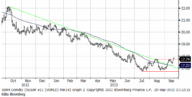 Marskontraktet på råsocker bröt det tekniska motståndet och vi har nu alltså köpsignal även tekniskt. Marknadsaktörer i Europa, som vi talat med är inställda på fortsatt överskott i sockermarknaden och inställda på fallande pris framöver. Min reflektion är att när branschen är så grundmurat negativ, är det god jordmån för en prisuppgång.