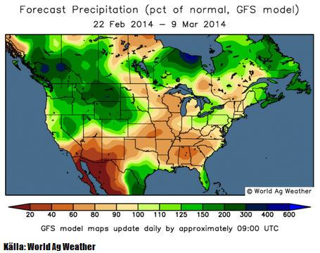 Iskylan och snöstormarna i norra USA har avlöst varandra och en ny storm väntas om några dagar. Det finns en oro för torka längre söderut. I kartbilden nedanför ser vi avvikelsen från det normala i tvåveckorsprognosen enligt GFS-modellen. Som synes väntas mindre nederbörd än normalt i de för jordbruk viktigaste delstaterna i USA.