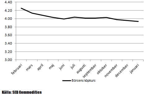 Som vi ser är genomsnittspriset som det är möjligt att säkra in över 4 kr både de närmaste sex månaderna och för det närmaste året.