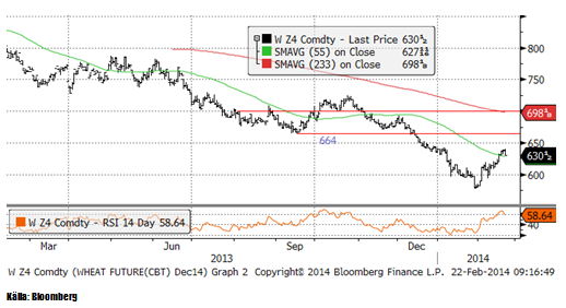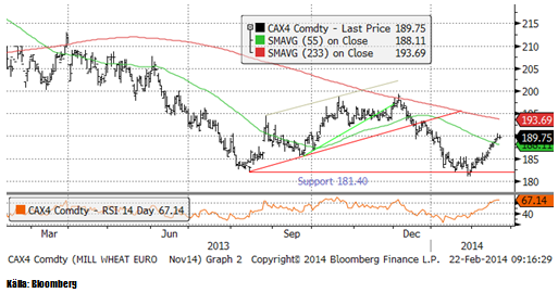 Oroligheterna i Ukraina verkar vara över, men det återstår att bilda en övergångsregering till dess val ska hållas i maj. Ordning, krediter, utsäde, drivmedel och gödsel ska fram för att vårbruket ska kunna starta i ett land som är bankrutt. Ryssland har stoppat köpen av Ukrainska statspapper (ett ryskt hjälpprogram) till dess oppositionen också lämnar in sina vapen, så allt är inte frid och fröjd i landet än. Höstvetet verkar dock må väldigt bra, precis som i EU, när det nu är på väg ur vintervilan.