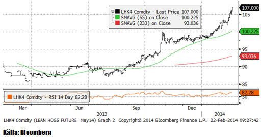 Lean hogs maj-kontrakt steg i veckan till 107 cent från förra veckans 104 cent. Efterfrågan i USA är stark, samtidigt som PED-virusets fortsatta spridning, som ännu inte nått kulmen, gör det svårt att möta efterfrågan. Priset får uppgiften att ransonera efterfrågan.