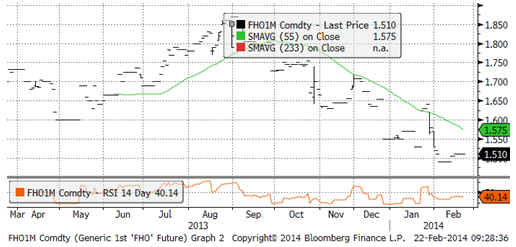 Nedanför ser vi Chicagovetet (Dec 14), som steg under nästan hela veckan, men avslutade med ett relativt stort prisfall.