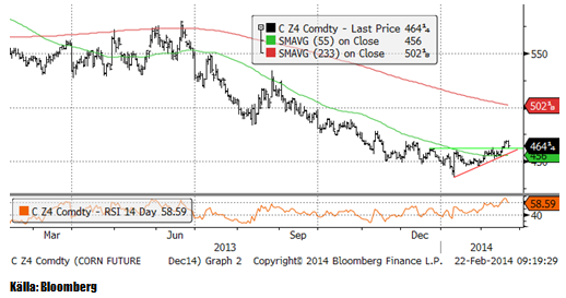 Vi noterade förra veckan att decemberkontraktet på majs blidat en så kallad ”triangelformation”. I veckan bröt marknaden den och steg, vilket är en teknisk köpsignal. I fredags föll dock marknaden efter att USDA presenterat en negativ framtid för majs vid sin Outlook Conference. Vi tycker att en del är märkligt och den känns väldigt världsfrånvänd med en prognos på majspriset på 390 cent i genomsnitt under kommande marknadsföringsår. Spekulantkollektivet håller inte heller med, eftersom de köpt tillbaka nästan 200,000 terminskontrakt de senaste månaderna. De är fortfarande netto korta marknaden, men bara med 20,000 kontrakt. Givet att inte priset går ner under stödlinjen, utan öppnar ungefär oförändrat på måndag, tror jag det är ett köptillfälle.