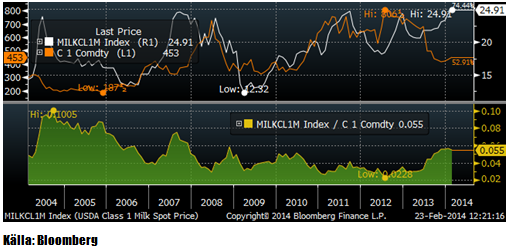 Om vi jämför priset på majs (typiskt foder i USA) med USDA:s spotprisnotering för First Class Milk, ser vi att relationen mellan foderpris och mjölkpris nästan fördubblades från mitten av förra året. Om man tittar noggrant ser man också att mjölkpriset ser ut att följa majspriset med några månaders eftersläpning. Om man ska tro på detta, kan det komma en rekyl nedåt på mjölkpriset.