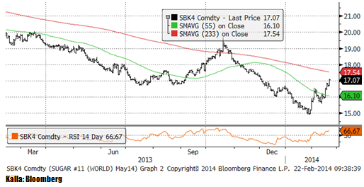 Kontraktet för den kommande skörden börjar nu handlas allt mer. Nedan ser vi kurdiagrammet för april 2015-kontraktet. Kontraktet fortsätter att handlas upp. För två veckor sedan låg det på 14.40, förra veckan på 14.50 och i fredags när börsen stängde, hade den nått 14.80 Euro per 100 Kg.