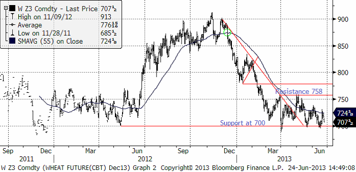 Decemberkontraktet på CBOT har funnit stöd på 700 cent och priset har inte velat gå under den nivån.