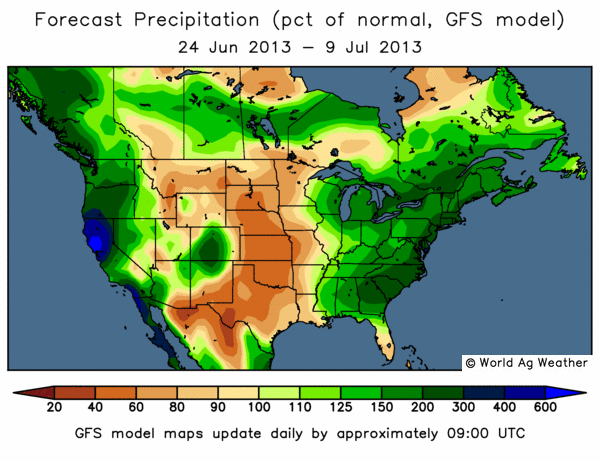 GFS-modellens prognos för de kommande två veckorna visar på ordentlig nederbörd längs väst- och östkusterna i USA och i södra Kanada. GFS-modellen (Global Forecast System) används av de amerikanska vädercentralerna för att göra globala väderleksprognoser. Kalifornien har varit torrt i ungefär tio år, men får nu ordentligt med nederbörd. Däremot fortsätter klassiska vete-områden i USA att vara torrare än normalt.
