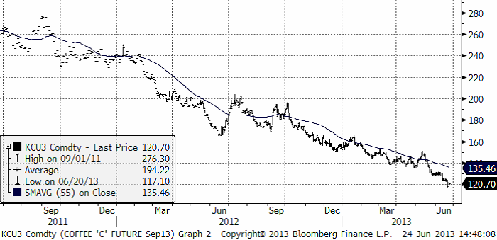 Kaffepriset har fallit ytterligare och har nu uppnått den storlek på prisfall som en nedgångsfas i kaffe brukar uppnå (-60%).