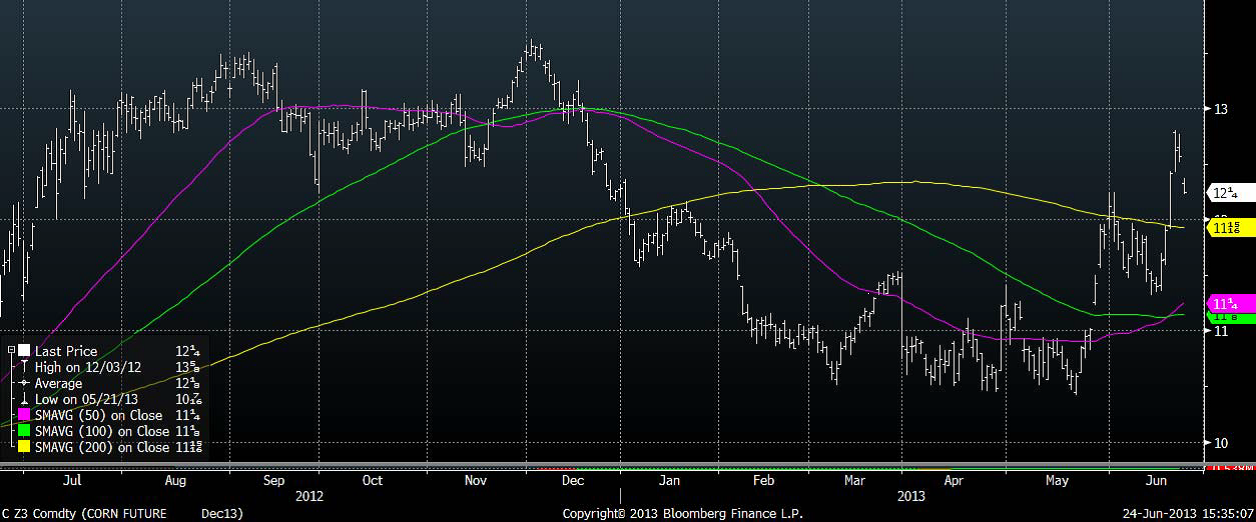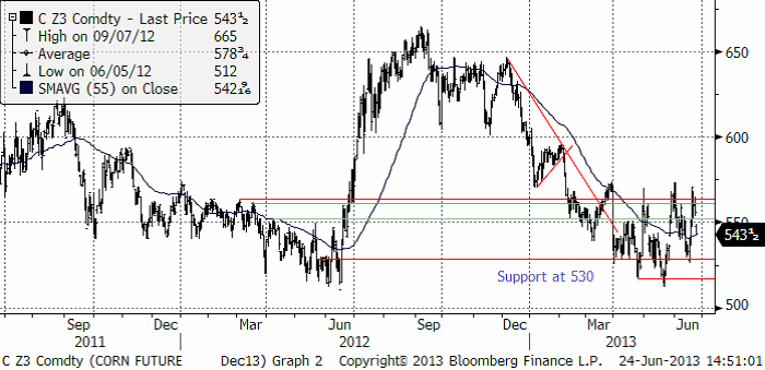 Majspriset (december 2013) har liksom vetet på Chicago funnit stöd på förra årets bottennivåer med 530 cent som den huvudsakliga bottennivån. Marknaden har visat en tendens att försöka stiga de senaste månaderna. Vi har noterat högre toppar och lägre bottnar i de senaste månadernas handel. Helhetsbilden ser dock ut som en rekyl efter den stora prisnedgången från 650 cent / bu. Om det handlar om det, kan nästa prisrörelse bli nedåt, mot 400 cent.