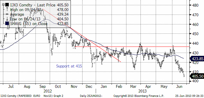 Rapspriset (November 2013) bröt genom stödet som hållit i ett halvår. När ett så ihärdigt stöd bryts är det alltid viktigt. Om inget ”bullish” kommer ur fredagens rapport om areal och lager för sojabönor på fredag, bör vi kunna se rapspriset testa och kanske falla under 400 euro per ton.