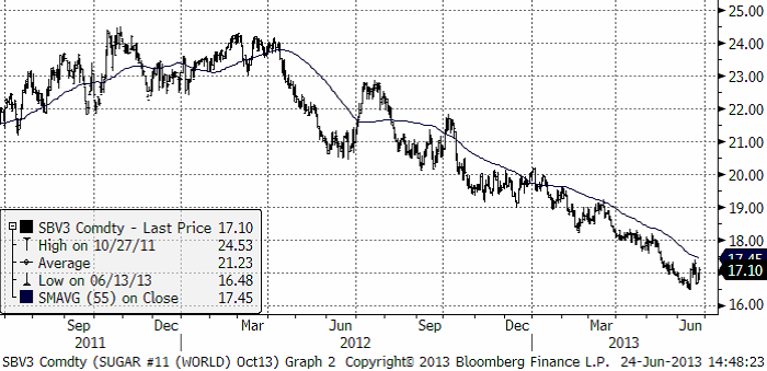 Priset på socker som tvärvände uppåt för en dryg vecka sedan, föll tillbaka, men inte hela vägen ner. Därefter har priset faktiskt vänt uppåt igen. Detta är en mikrorörelse i förhållande till det stora prisfallet som har pågått i över två år, men eftersom det sker på en så låg nivå att en botten kan vara nära, är det värt att hålla ett öga på utvecklingen framöver. Vi fortsätter tills vidare med neutral rekommendation. En uppgång till 18 cent skulle nog göra att vi bytte till köprekommendation.