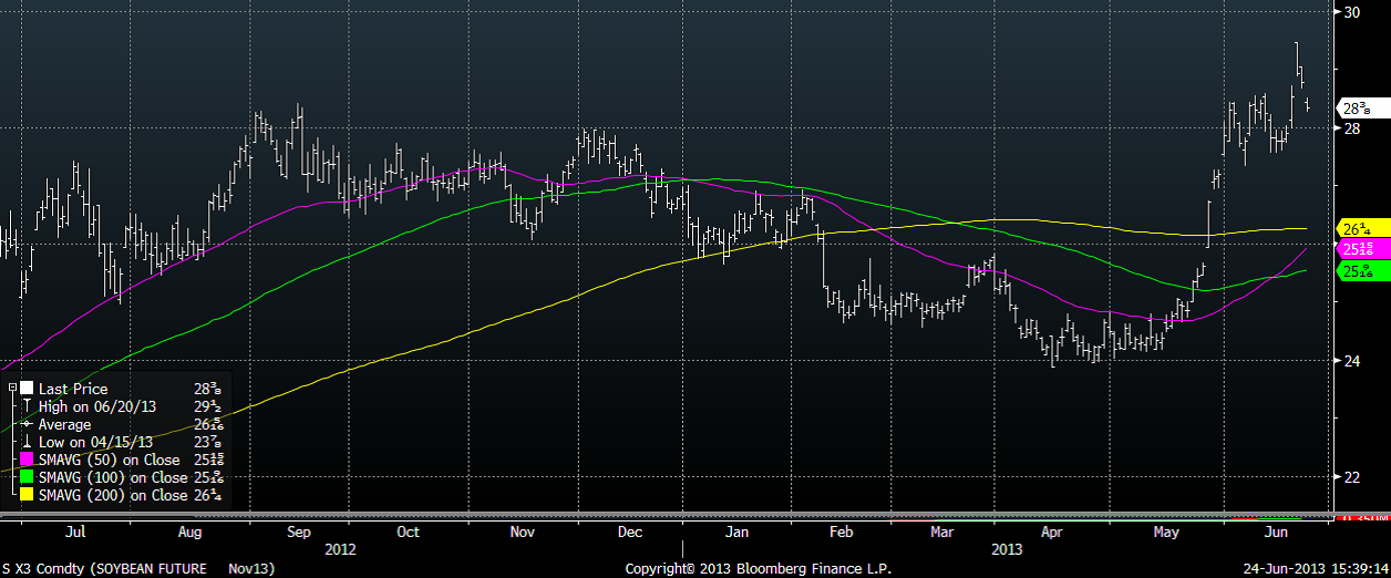 På fredag publicerar USDA statistik på sådd areal och lager. Det spekuleras i att den sena sådden har minskat arealen, men den sena sådden kan också ha minskat majsarealen och ökat sojaarealen. Marknaden förväntar sig faktiskt att sojaarealen har ökat. Den förväntar sig också att exportsiffrorna har varit för höga och att lagren därmed är större än man tidigare trott. Detta skulle kunna få priset att falla ner mot 10 dollar per bushel, resonerar man.