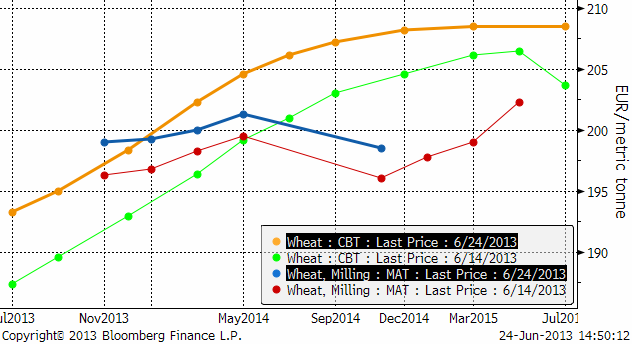 Nyheten att Kina köpt 200 kt vete från Frankrike fick prisfallet på Matifs novembertermin att stanna upp. GASC meddelade att de kommer att bjuda in till en tender före 30 juni. De har varit borta från marknaden sedan i februari. Vi betraktar rekylen upp mot 200 euro som just en rekyl mot trenden och att prisfallet fortsätter.