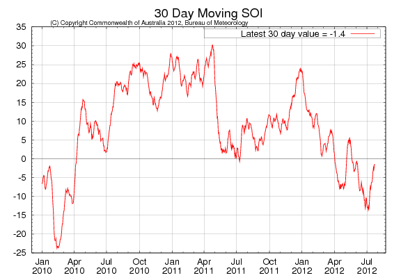 Southern Oscillation Index har stigit från El Niño-nivåer på mer än -8. Nu ligger indexet på -1.4. Det indikerar neutrala ENSO-förhållanden. Sådden i Argentina är i full gång och >80% är redan i marken, dock i betydligt mindre omfattning än tidigare år. Det är böndernas protest mot presidentens konfiskatoriska skatt på veteproduktionen. Både Rosario Grain Exchange och BAGE har estimerat att arealen är 22% mindre än förra året. USDA har INTE tagit hänsyn till denna minskning i sitt estimat från juli WASDE.