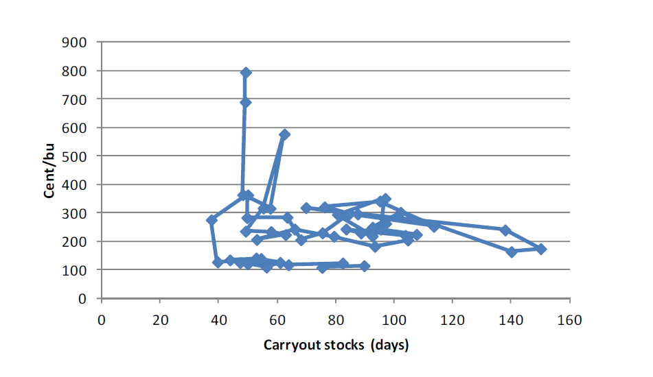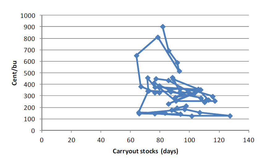 Nedan ser vi relationen mellan pris och utgående lager, enligt USDA. USDA får med all sannolikhet sänka sitt estimat av utgående lager, så vi får tänka oss att juli-2012-punkten (den högsta i diagrammet) kommer att flyttas till vänster i diagrammet. Priset är högt, men det är inte orimligt att tänka sig att relationen kan stämma överens med de senaste årens relation mellan lager och pris.
